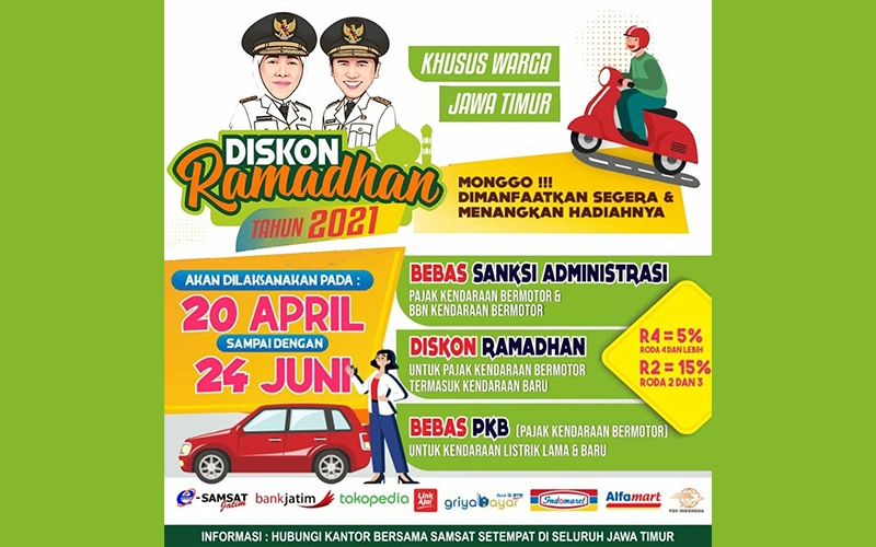 SURABAYA, DDTCNews – Pemprov Jawa Timur menggulirkan program insentif pajak kendaraan bermotor pada momen Ramadan tahun ini.