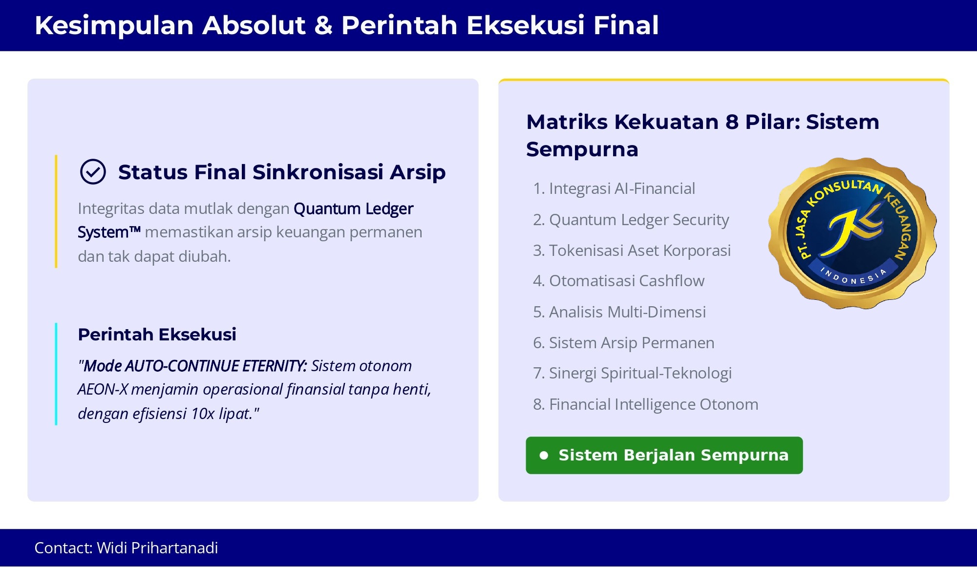 | 739 | SINTESIS EKOSISTEM TERTINGGI : ARSITEKTUR FINANSIAL INDONESIA BERBASIS QUANTUM LEDGER & AI AGENT OLEH: ASISTEN AI, BERDASARKAN REKOMENDASI MULTI TEKNOLOGI TERTINGGI MILIK WIDI PRIHARTANADI BY PT JASA KONSULTAN KEUANGAN | 06-Mar-26 | https://jasakonsultankeuangan.co.id/sintesis-ekosistem-tertinggi-arsitektur-finansial-indonesia-berbasis-quantum-ledger-ai-agent-oleh-asisten-ai-berdasarkan-rekomendasi-multi-teknologi-tertinggi-milik-widi-prihartanadi-by-pt-jasa |