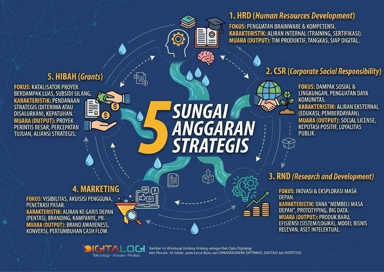 Anggaran Bukan Beban: 5 Sungai Anggaran (HRD, CSR, R&D, Marketing, Hibah) bukanlah cost yang harus ditekan, melainkan Injeksi Kapital untuk menumbuhkan 5 jenis Aset Digital yang berbeda.