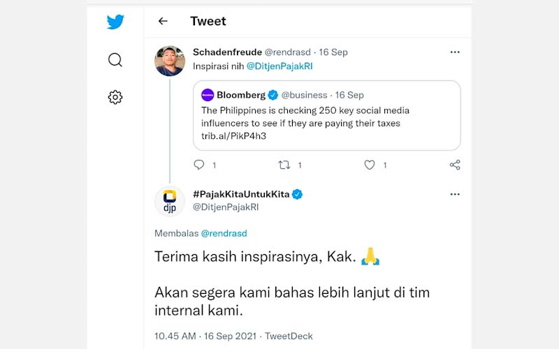 Akun @rendrasd menandai akun @DirjenPajakRI dalam cuitannya yang mengutip sebuah link berita tentang pemeriksaan kepatuhan pajak influencer di Filipina. Menurutnya, langkah otoritas pajak Filipina itu bisa menjadi inspirasi dan diikuti DJP.