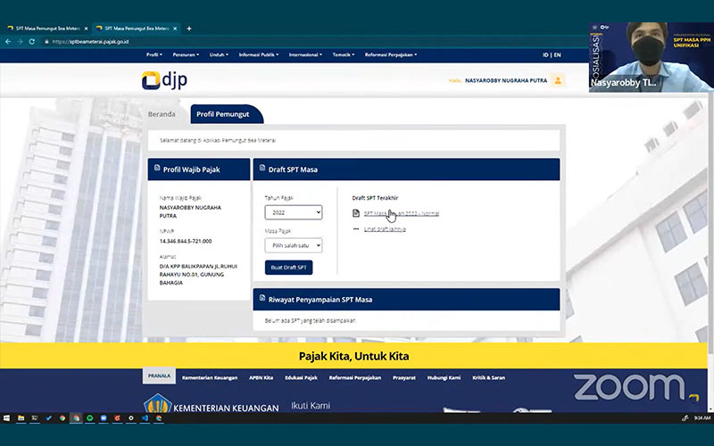 Dalam acara Sosialisasi e-Meterai dan Pelaporan SPT Masa Bea Meterai, Nasyarobby mengatakan setelah masuk ke laman sptbeameterai.pajak.go.id, wajib pajak dapat mencoba simulasi pelaporan SPT Masa bea meterai. Namun, simulasi tidak sampai pada tahap pembuatan billing dan pelaporan.