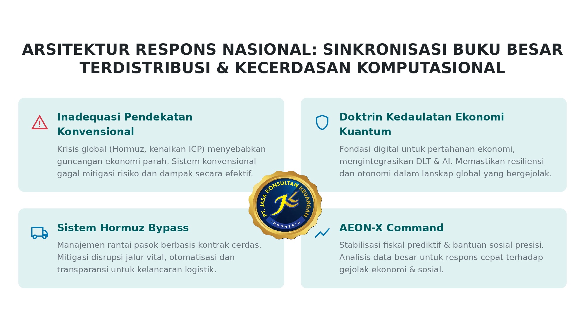 Ancaman eskalasi geopolitik di Selat Hormuz pada tahun 2026 membawa konsekuensi langsung terhadap struktur fiskal dan neraca perdagangan Republik Indonesia. Proyeksi yang disusun dalam seri analisis Krisis Minyak Global 2026 (V1–V5) serta Doktrin Kedaulatan Ekonomi Kuantum (Whitepaper V1–V3) menunjukkan bahwa tanpa intervensi sistemik, lonjakan harga minyak mentah Indonesia (ICP) ke level US$120 per barel akan mendorong beban subsidi energi menembus Rp680 triliun serta menekan nilai tukar Rupiah menuju ambang Rp18.500 per Dolar Amerika Serikat.