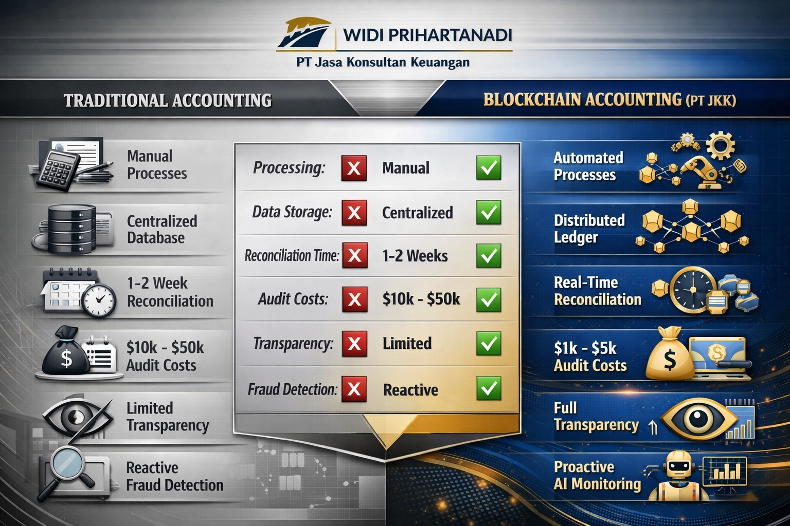 Right: Blockchain Accounting (blue-gold) – Automated, distributed, real-time, affordable ]