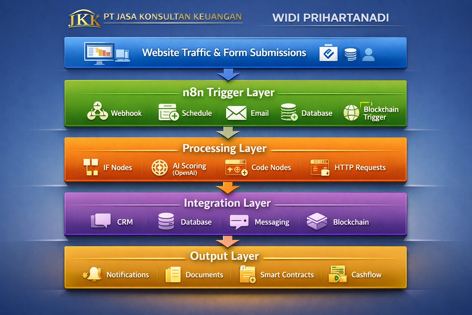 Dimensi 2: Intelligence Processing (n8n Workflow, OpenAI GPT-4, ML Models) Dimensi 3: Integration & Execution (CRM, Database, Blockchain, Payment) Dimensi 4: Output & Monetization (Invoice, Payment, Dashboard, Reporting)