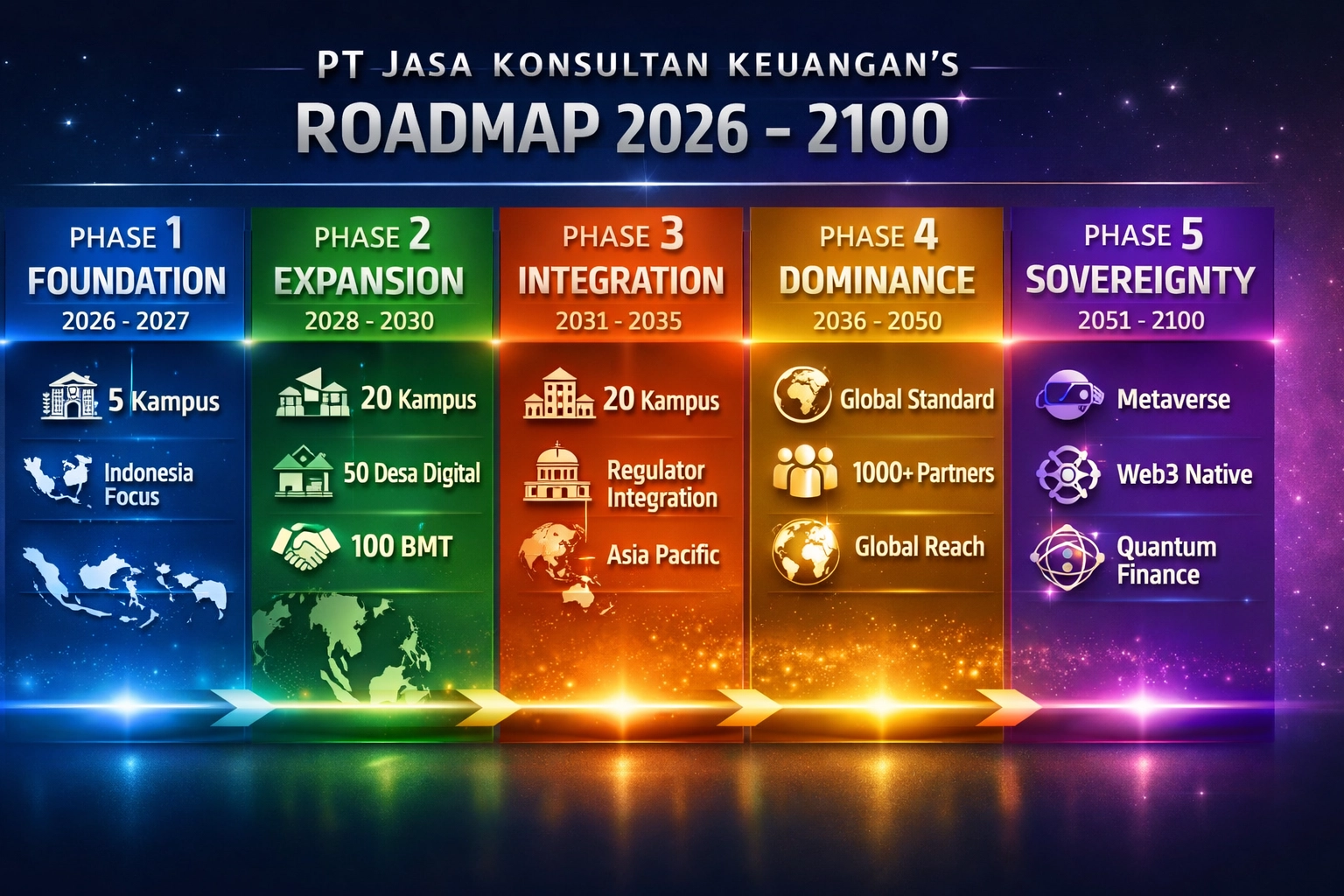 Dengan roadmap hingga 2100, PT Jasa Konsultan Keuangan siap mendominasi ekonomi digital global melalui teknologi tertinggi Blockchain dan AI yang dimiliki oleh Widi Prihartanadi, menciptakan ekosistem finansial terdesentralisasi yang sustainable, transparent, dan profitable.