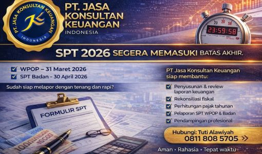 SPT 2026 segera memasuki masa penutupan. By PT Jasa Konsultan Keuangan  📌 WPOP – 31 Maret 2026📌 SPT Badan – 30 April 2026 Apakah laporan Anda sudah siap dengan rapi dan percaya diri? Pelaporan pajak bukan sekadar kewajiban tahunan, tetapi bagian penting dari tata kelola keuangan yang sehat dan profesional. Dengan persiapan yang tepat, proses