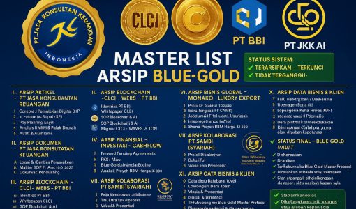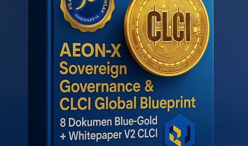 AEON-X Sovereign Governance & CLCI Global Blueprint 8 dokumen Blue-Gold + Whitepaper V2 CLCI Secara arsitektur, isi 8 dokumen ini membentuk satu “mesin”: Master Source v8.3 – Infinite Blue-Gold Kitab induk 120+ halaman: legalitas PT JKK & PT BBI, blueprint ekspansi 2025–2030, kerangka regulator (OJK, Bappebti, BPK, Kemenkeu), valuasi investor, AI, Blockchain, TON, CLCI, Quantum