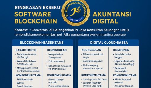 Ringkasan Eksekutif: Software Akuntansi Blockchain Digital Topik: Pengembangan Software Akuntansi Hybrid (Blockchain + Cloud Digital) Konteks Percakapan Percakapan ini merupakan dialog intensif antara Widi Prihartanadi dan asisten AI mengenai pengembangan sistem software akuntansi yang menggabungkan dua paradigma teknologi: Blockchain dan Cloud Digital. Tujuan utama adalah membantu PT Jasa Konsultan Keuangan memiliki software akuntansi tersebut
