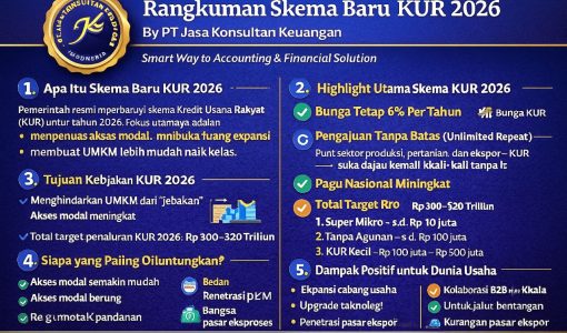 # ⭐ Rangkuman Skema Baru KUR 2026 ## By PT Jasa Konsultan Keuangan *Smart Way to Accounting & Financial Solution* ## 🔵 1. Apa Itu Skema Baru KUR 2026? Pemerintah resmi memperbarui skema Kredit Usaha Rakyat (KUR) untuk tahun 2026. Fokus utamanya adalah memperluas akses modal, membuka ruang ekspansi, dan membuat UMKM lebih mudah